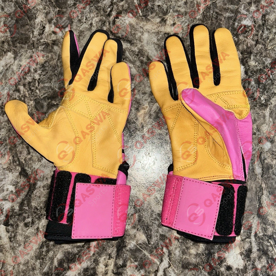 Custom Logo Long Cuff Baseball Batting Gloves Pink Black & Yellow Color Combo Cowhide Leather Baseball Batting Gloves
