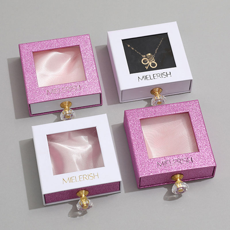 Boîte à bijoux de luxe personnalisée avec logo, tiroir, poignée en cristal, fenêtre en PVC, pour collier, boucles d'oreilles, bracelet, rangement cadeau
