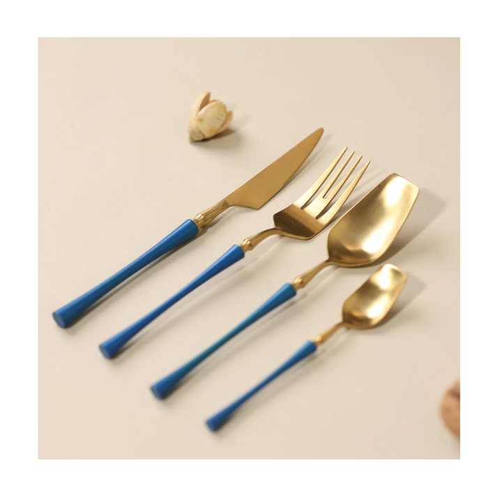 Ensemble de couverts de luxe avec Logo personnalisé, poignées bleues, pour Restaurant, voyage, acier inoxydable, 4 pièces, couverts dorés pour fournitures de Restaurant