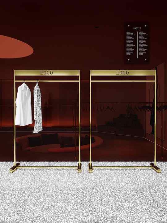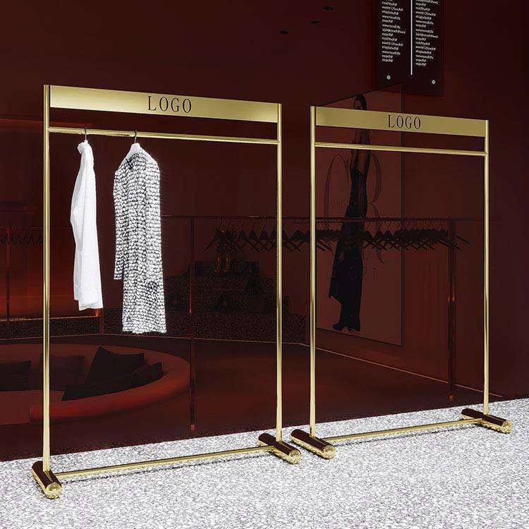 Portants de présentation de vêtements de luxe avec logo personnalisé, en métal doré, en acier inoxydable, support de présentation de vêtements, étiquette de marque de boutique, support suspendu