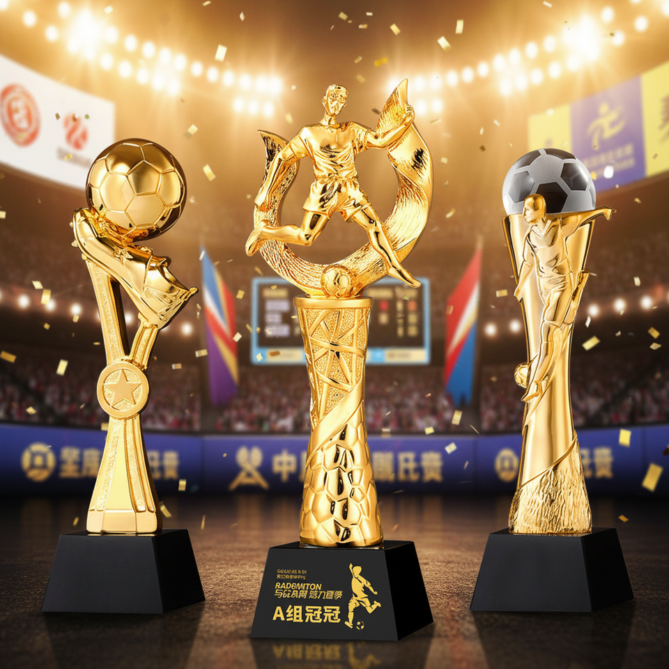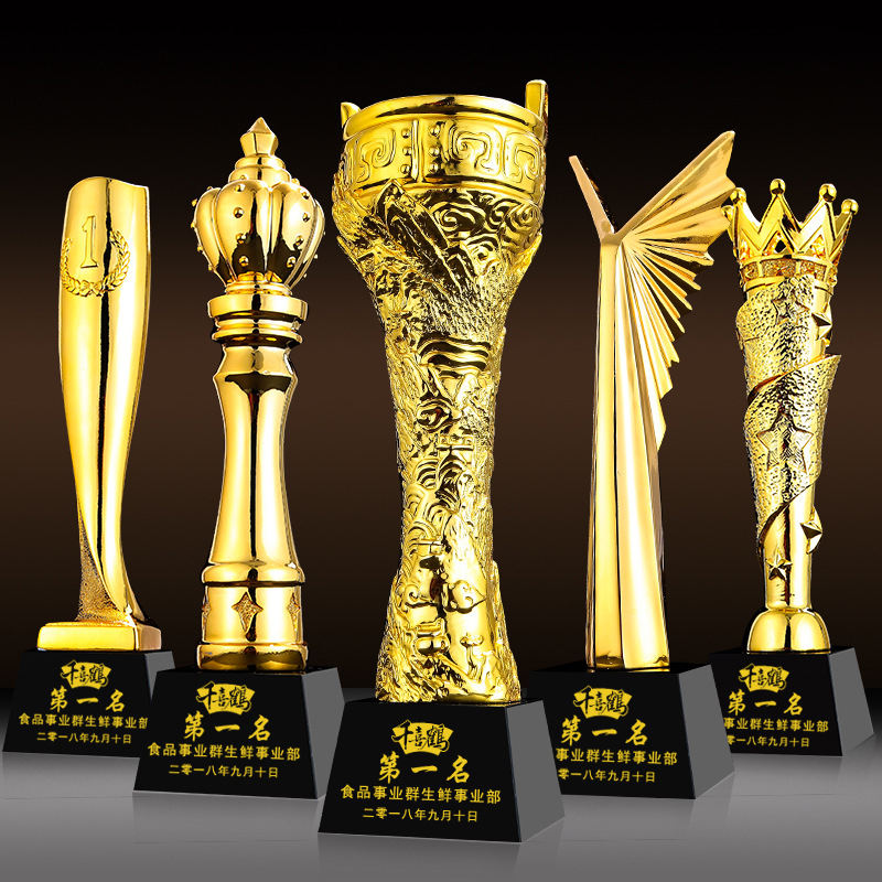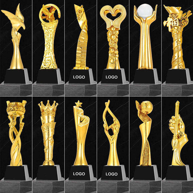 Trophées en résine dorée personnalisés avec logo sur mesure, design artistique peint, pour des réalisations exceptionnelles