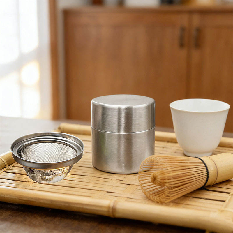 Boîte à matcha personnalisée avec logo, tamis à mailles fines, pot de stockage de poudre, 300 ml, acier inoxydable, qualité alimentaire, durable, portable, anneaux de tamis