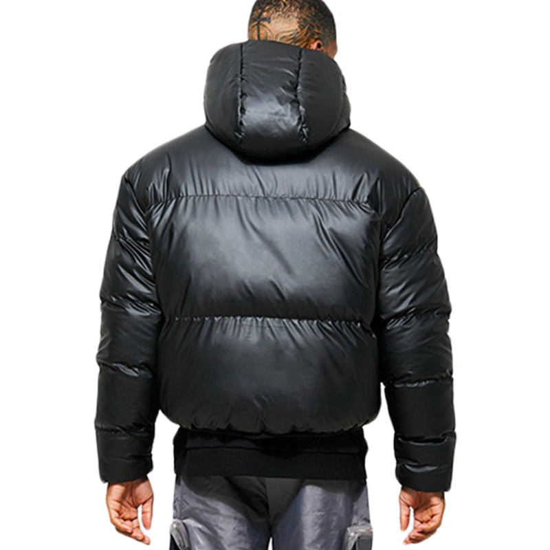 Veste matelassée pour homme avec logo personnalisé, finition brillante, noire, courte, style bulle, chaude pour l'hiver, avec capuche, vêtements d'extérieur, fabrication OEM, vente en gros