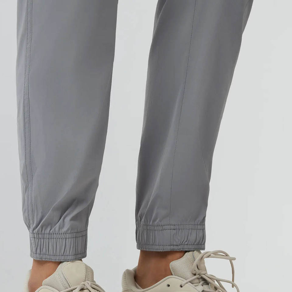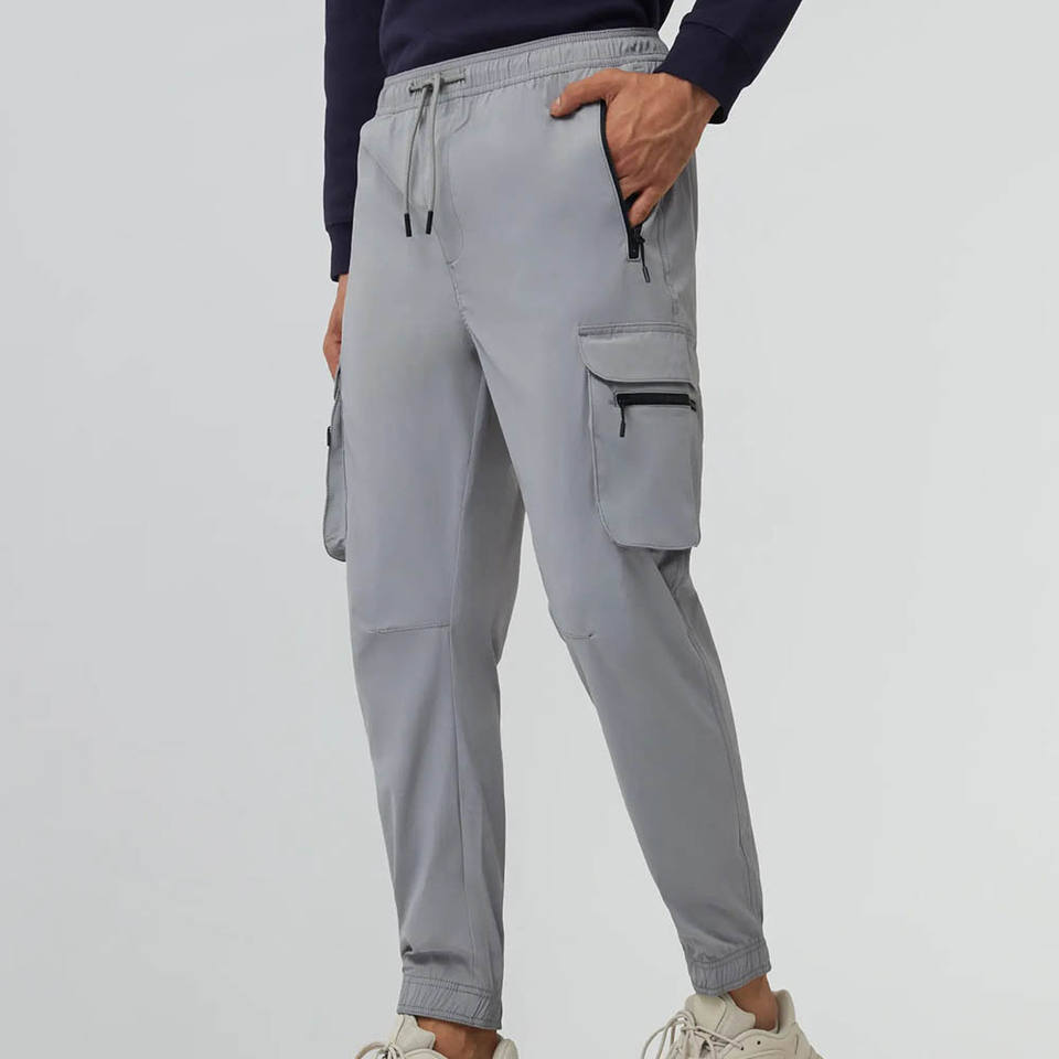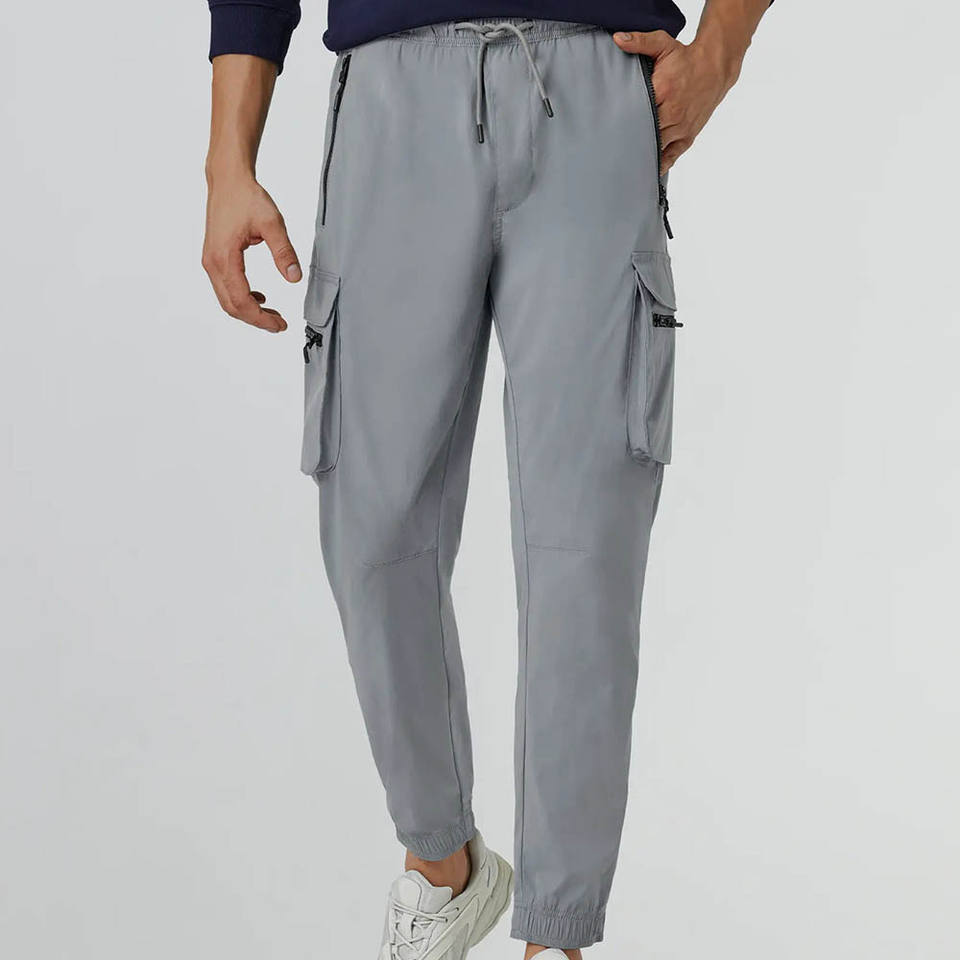 Jogging pour homme gris cendré à séchage rapide avec logo personnalisé, respirant, avec poches à rabat sur les jambes et poche arrière avec fermeture éclair