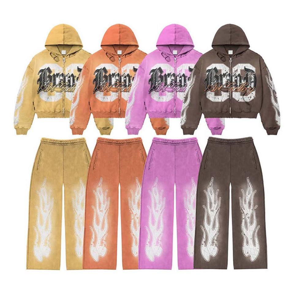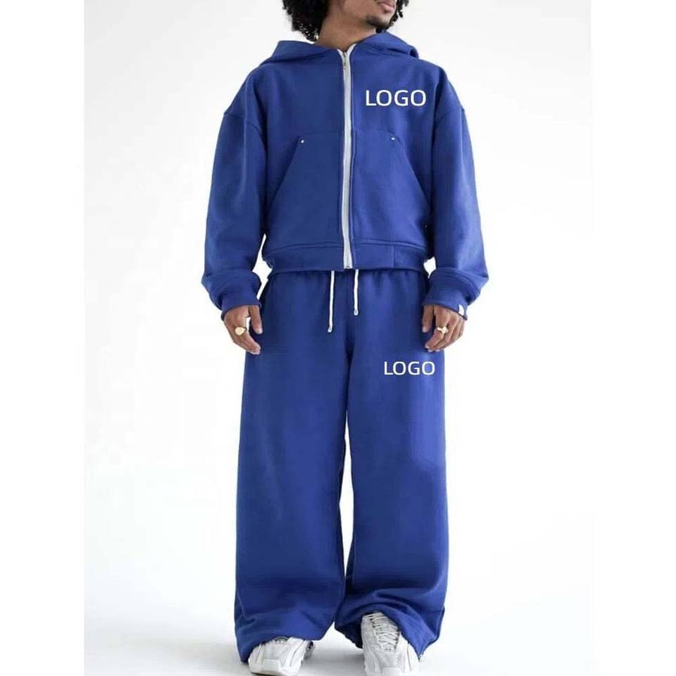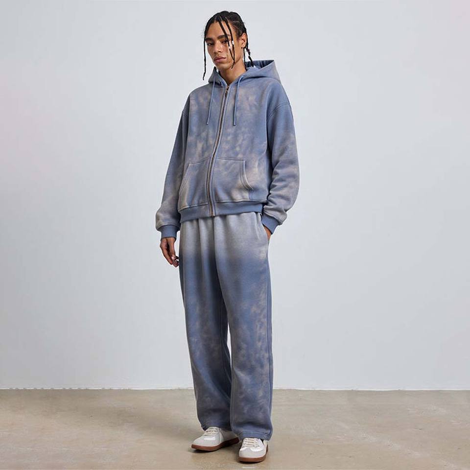 Custom Logo Men's Plain Dyed Tracksuits Fleece Zipper Hooded And Sweatpants Hoodie Set for Men