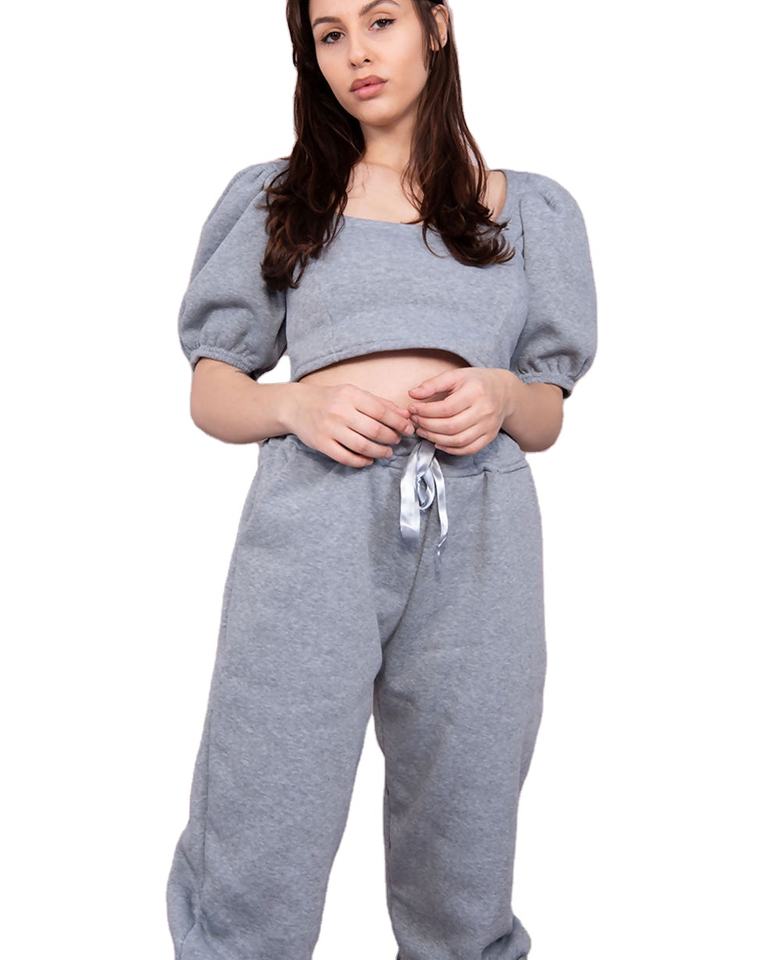 Customize Grey Puff Sleeve Cropped Top And Jogger Lounge Set