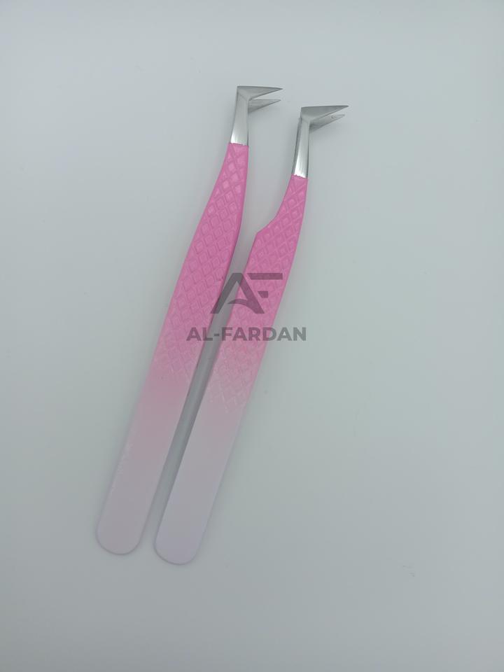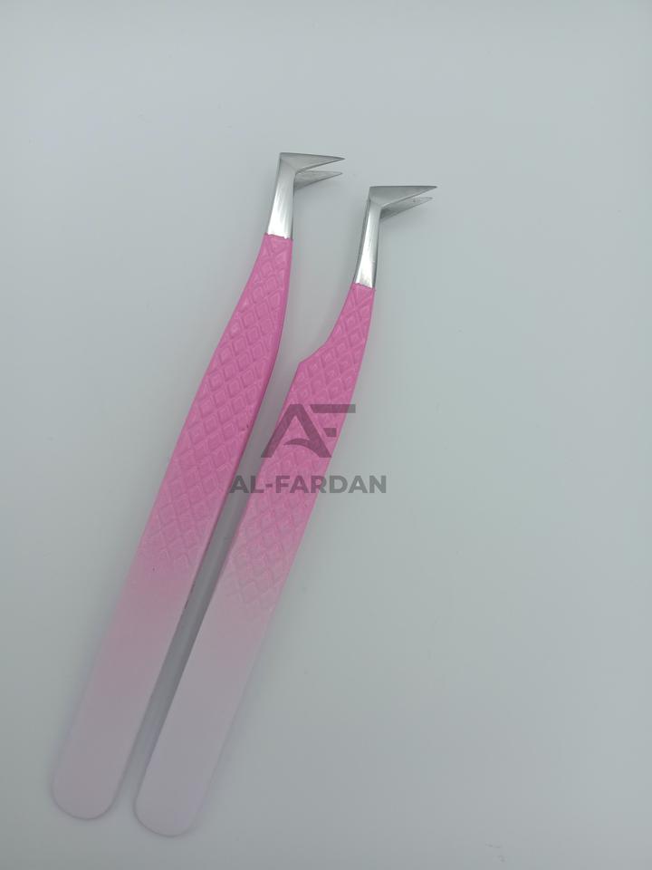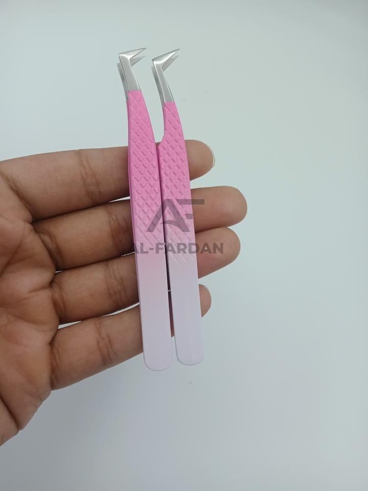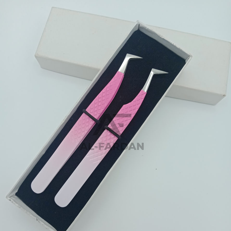Pince à épiler pour extensions de cils en acier inoxydable massif, couleur rose ombré et blanc, avec logo personnalisé, et boîtes de rangement.