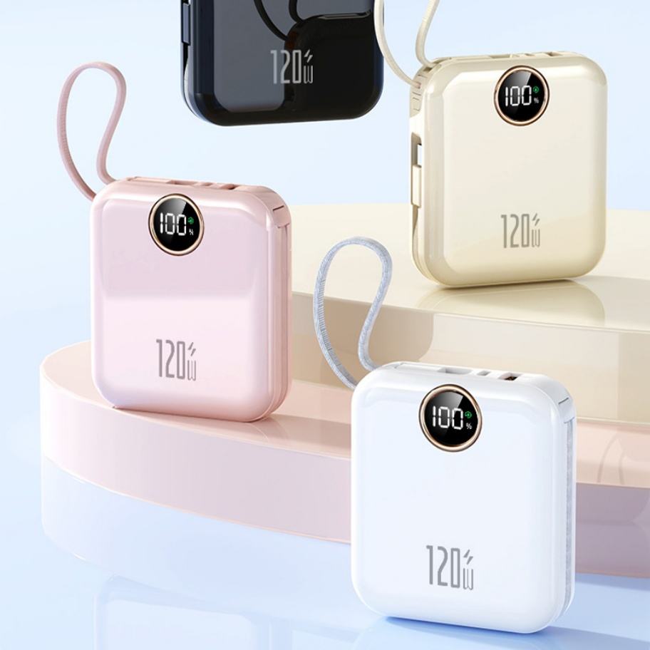 Batterie externe portable haute capacité 10000 mAh avec logo personnalisé, charge rapide PD22.5W, câble intégré et écran LED pour extérieur