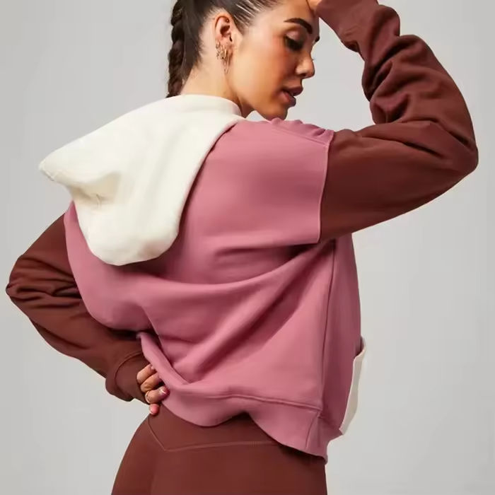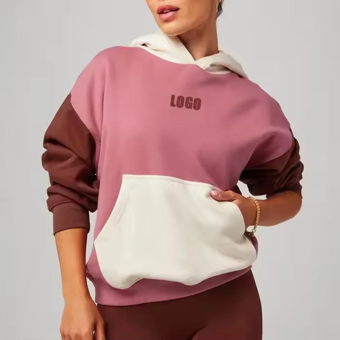 Sweat à capuche oversize pour femme en molleton 100% coton, style streetwear, sport et gym, avec logo personnalisé, patchwork rose et blocs de couleur
