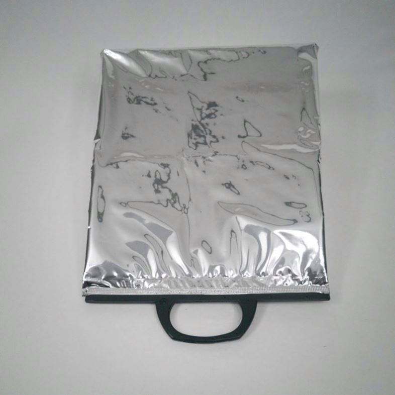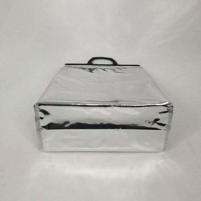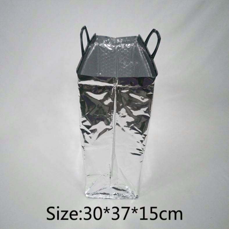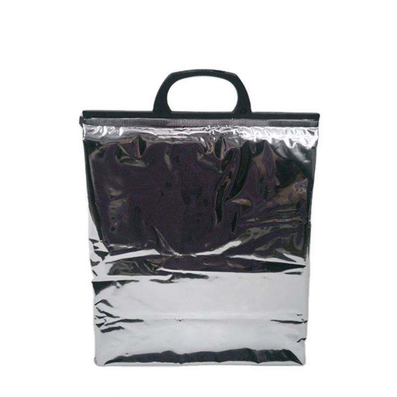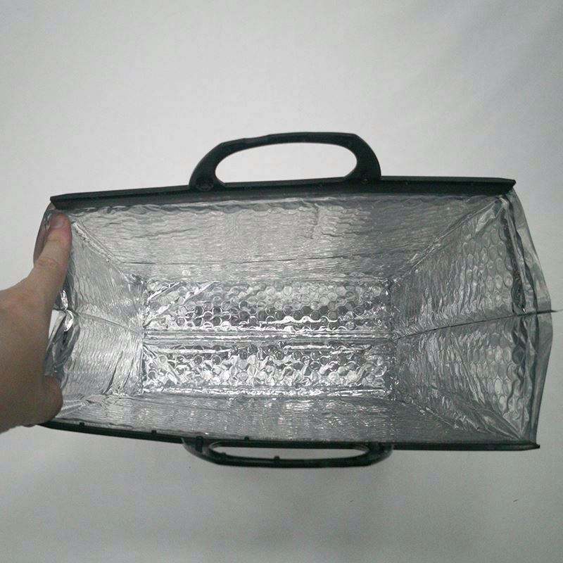 Sac isotherme portable personnalisé avec logo, en aluminium, pour livraison, repas à emporter, fruits de mer, ou comme sac à déjeuner.