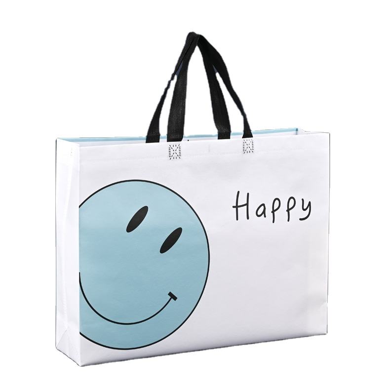 Sac tissé à motif de visage souriant bleu imprimé de logo personnalisé sac fourre-tout d'épicerie réutilisable sacs à provisions non tissés manipulés