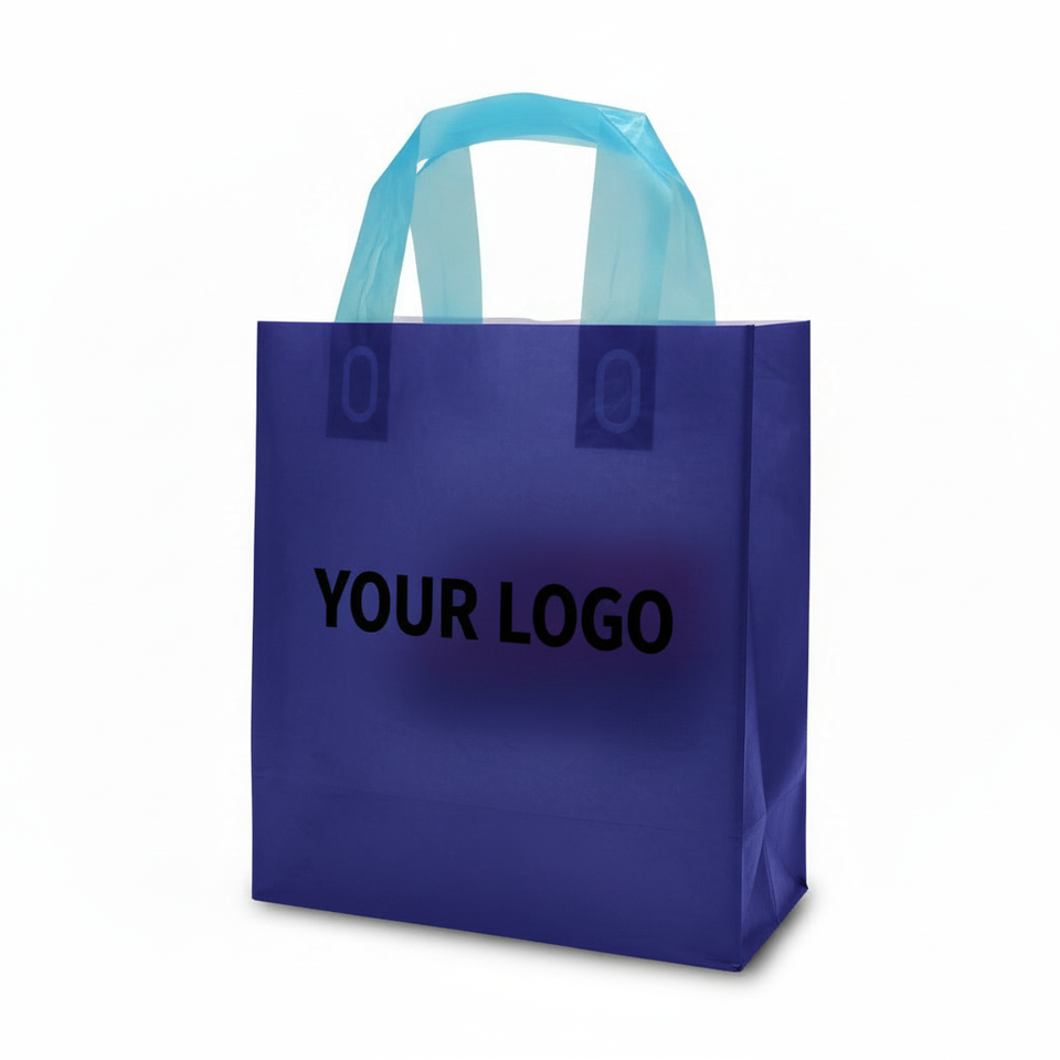 Sac de shopping en plastique personnalisé avec logo imprimé, impression personnalisée, finition mate givrée, promotion commerciale, avec poignée souple