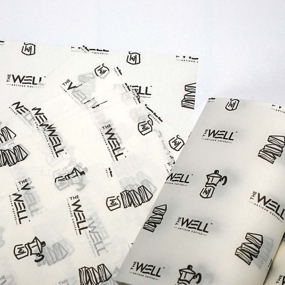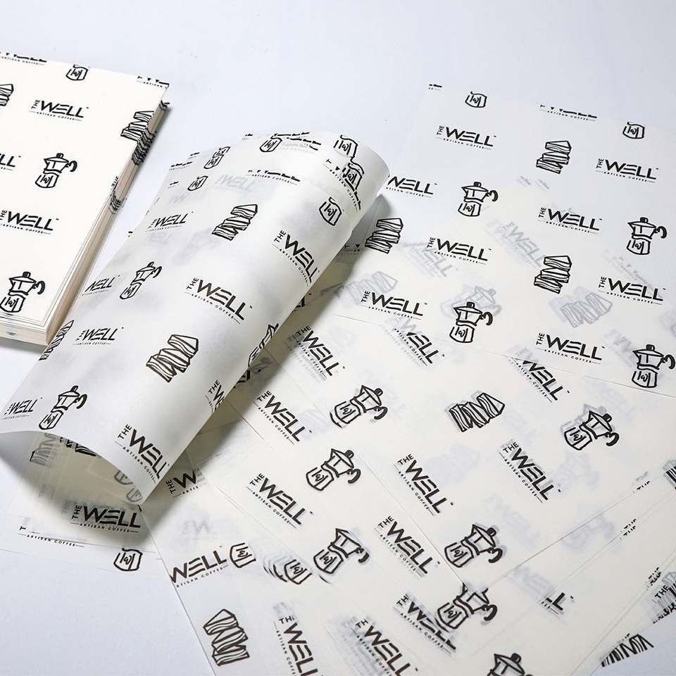 Papier ciré enduit de PE imprimé avec logo personnalisé, résistant à la graisse, pour emballer les aliments : viande de charcuterie, hamburgers, frites, sandwichs, pain, pizza