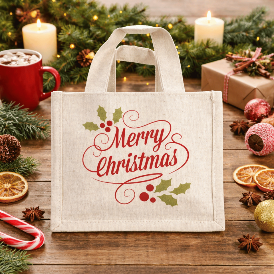 Sac cadeau moyen réutilisable avec logo personnalisé imprimé | Sac de courses Jucos au design festif de Noël, vente en gros, écologique
