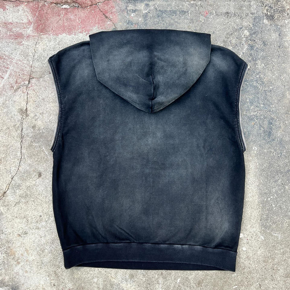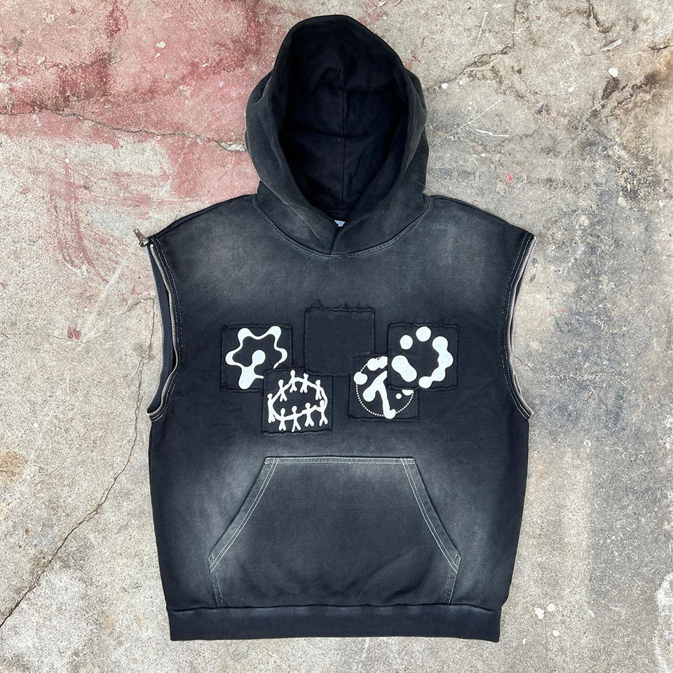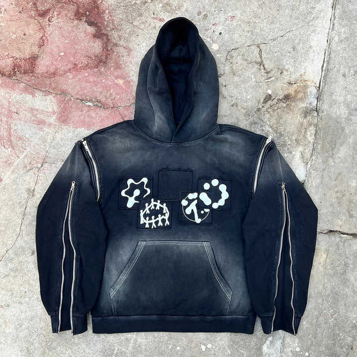 Sweat-shirts à capuche pour hommes en coton mélangé lourd, avec logo personnalisé imprimé, effet vintage délavé et patchs brodés, à capuche convertible