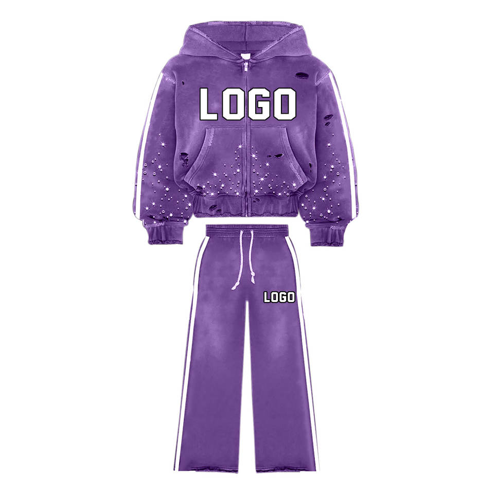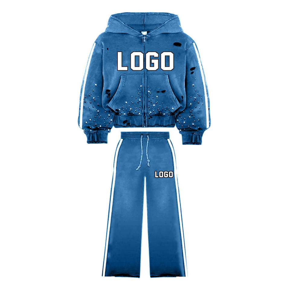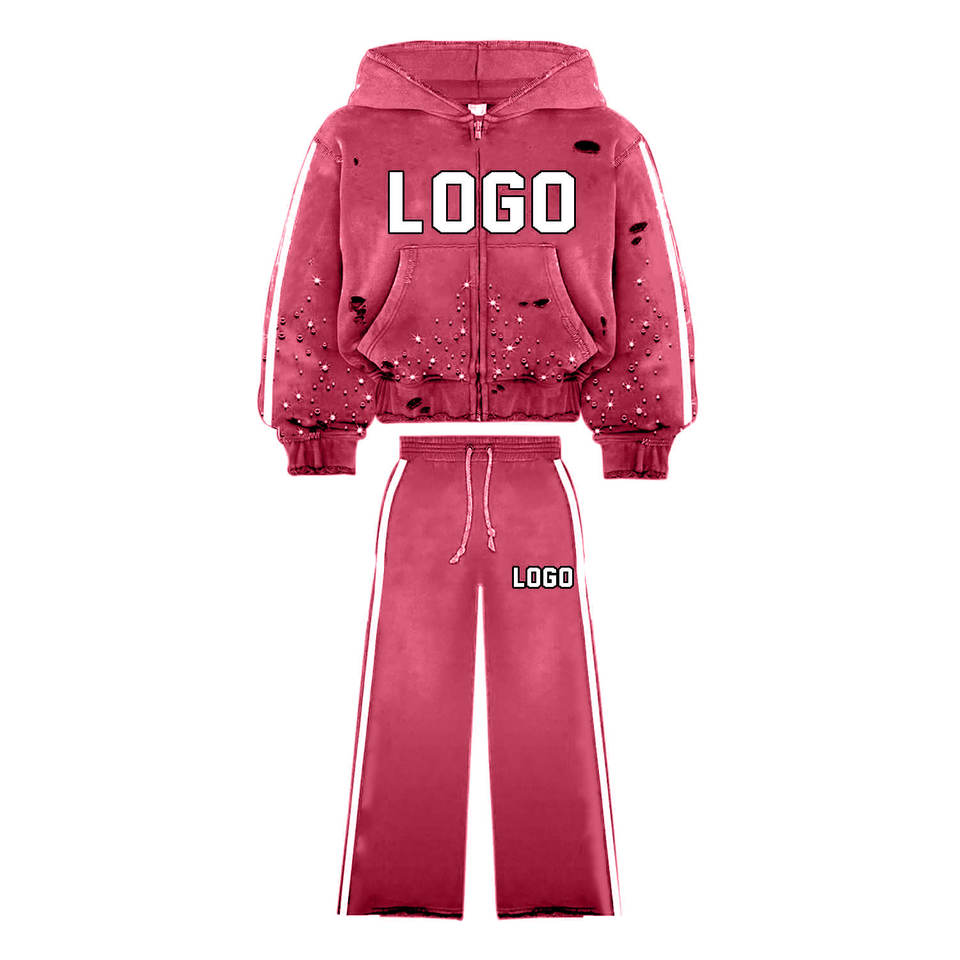 Survêtements imprimés avec logo personnalisé pour hommes, ensemble de pantalons de survêtement à capuche deux pièces vintage délavé pour hommes, survêtement à jambe large et fermeture éclair pour hommes