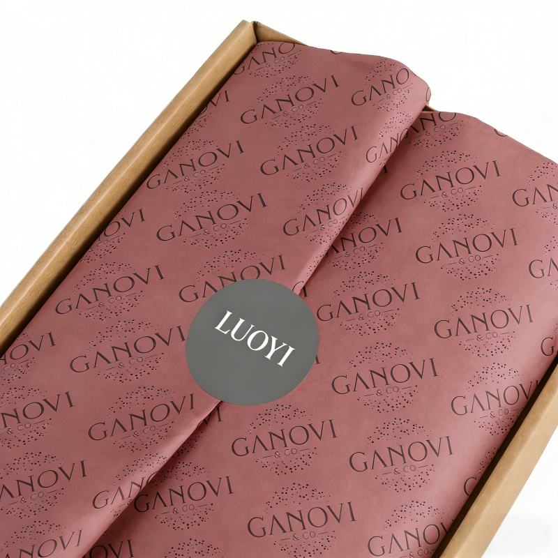 Papier synthétique couché avec impression de logo personnalisé en rose, blanc et noir pour l'emballage de vêtements, chaussures, t-shirts, chaussettes, vin, papier de soie
