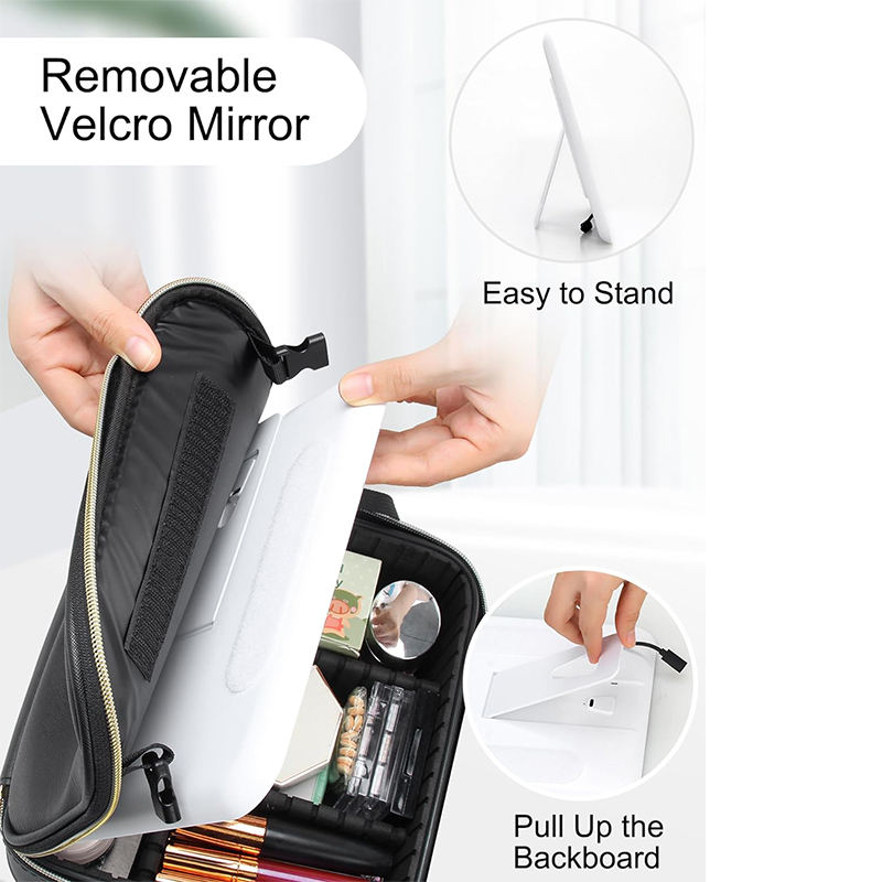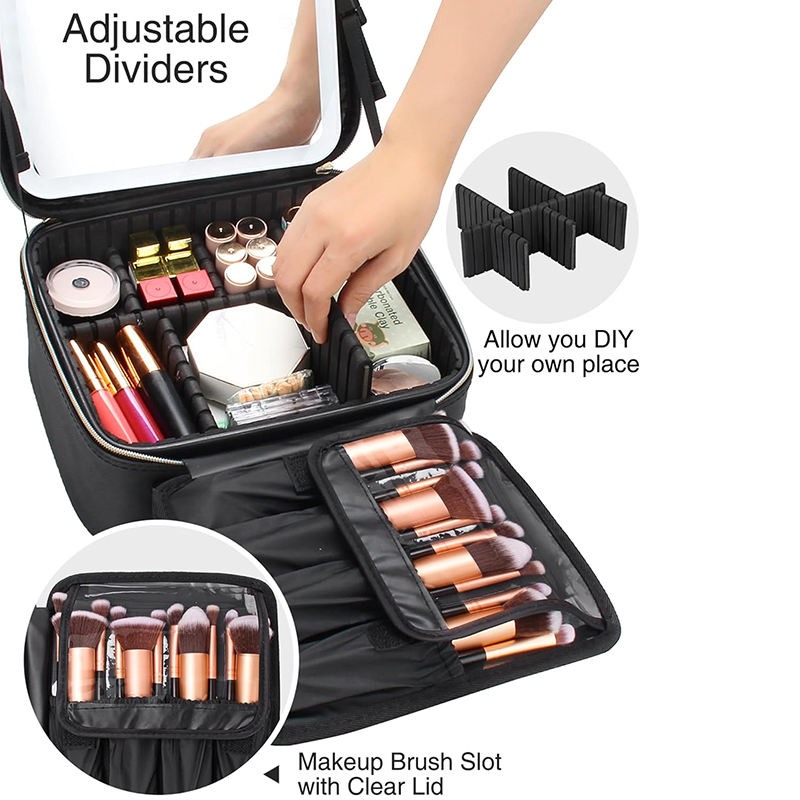 Trousse de maquillage de voyage en cuir avec logo personnalisé, organisateur professionnel de pinceaux, avec miroir éclairé par LED 3 lumières de couleur