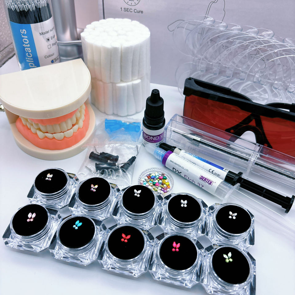 Kit de démarrage professionnel de pierres précieuses pour dents en cristal avec logo personnalisé lumière de polymérisation à LED colle professionnelle 37% prix du kit de pierres précieuses pour dents en gel