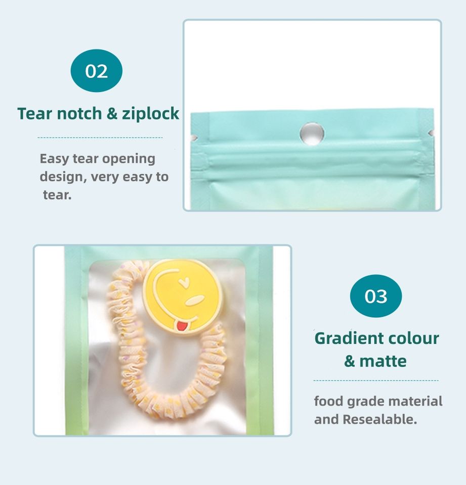 Sacs d'emballage en plastique refermables avec logo personnalisé, étanche, rose, violet, accessoire, fermeture éclair, fermeture éclair en mylar avec trous de suspension