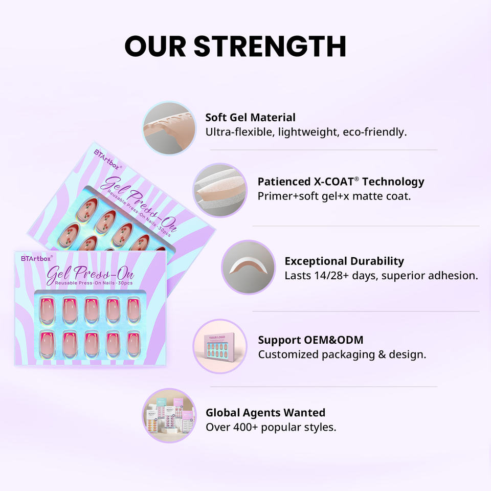 Faux Ongles Personnalisés Logo Court Amande Carrés, en Gel Souple à Coller, Fait Main, French Manucure, Kit en Gel Vente en Gros