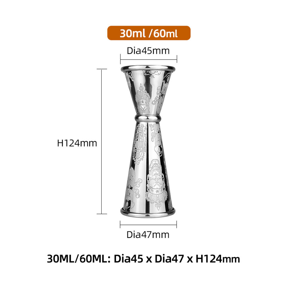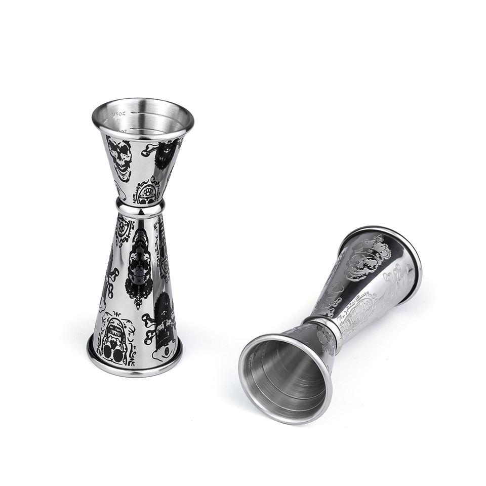 Jigger de barman double face en acier inoxydable SS304 de 30/60 ml avec logo personnalisé gravé en forme de crâne, pour mélanger les cocktails et mesurer les boissons