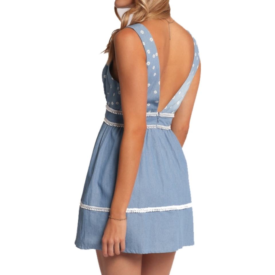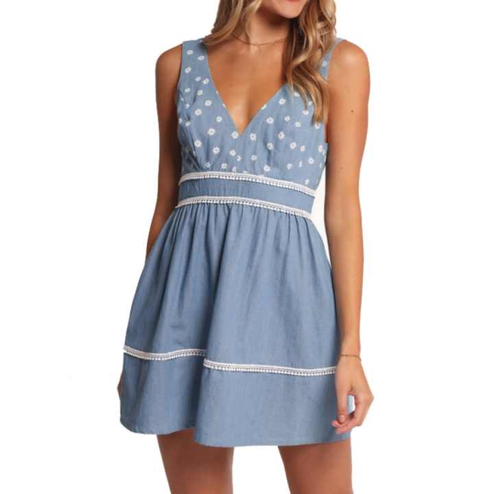Robe en jean sans manches à col en V avec imprimé floral et logo personnalisé, mini-robe d'été pour femme avec bordure en dentelle