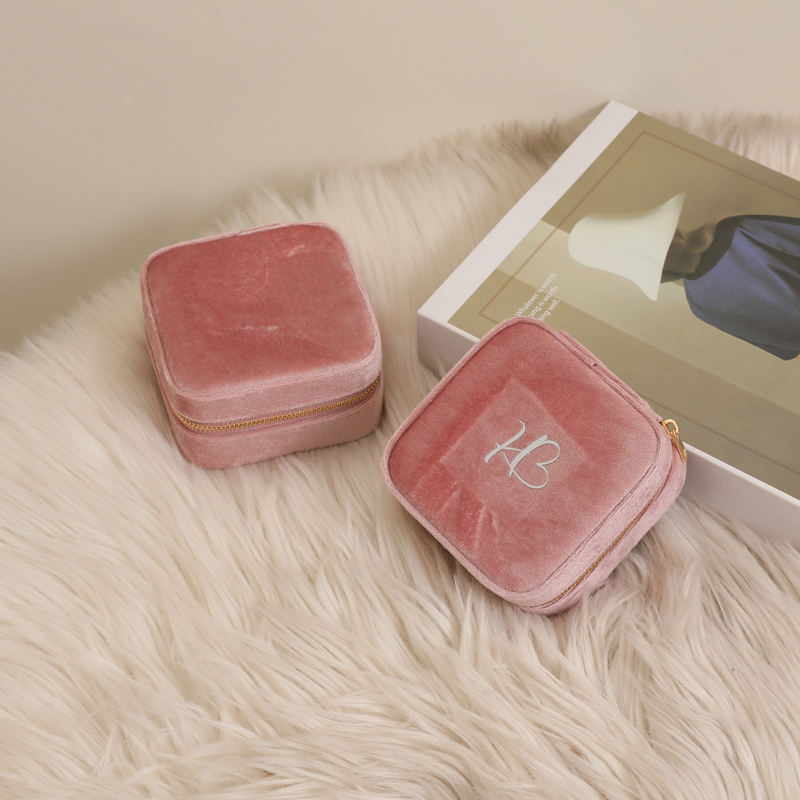 Boîte à bijoux portable en velours vert avec logo personnalisé et patchs en chenille pour ranger bagues, colliers, boucles d'oreilles, idéale pour les voyages