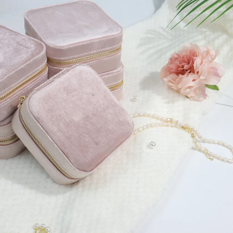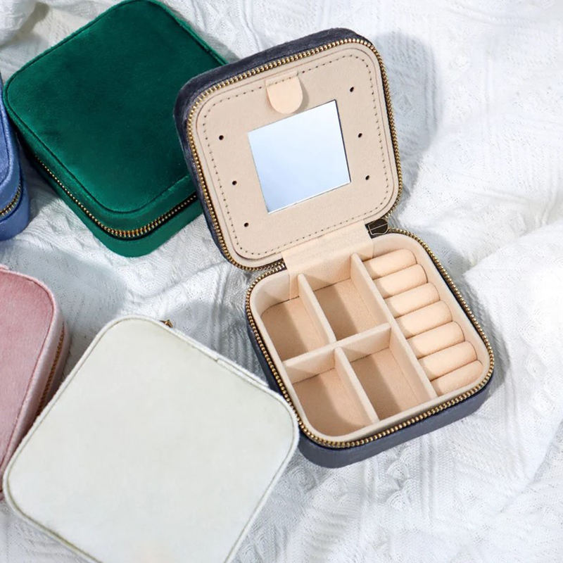 Boîte à bijoux de voyage avec miroir de rangement carré personnalisé avec logo, organisateur, boîte à bijoux en velours avec fermeture éclair, colliers, boucles d'oreilles avec matériau en peluche