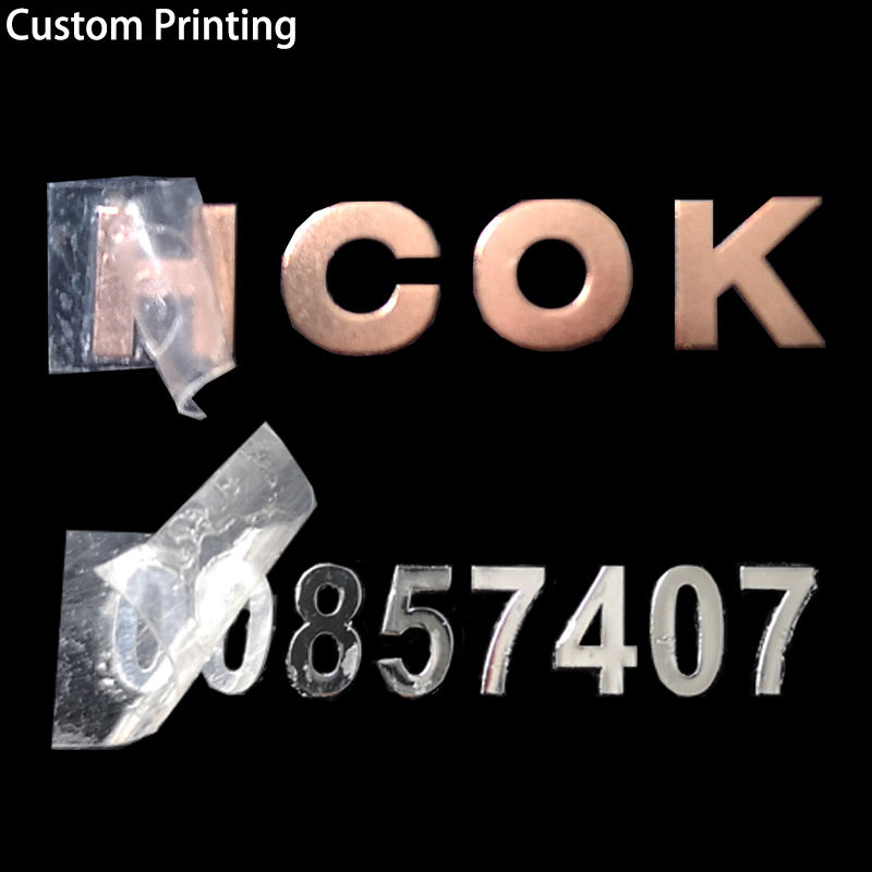 Autocollants de transfert personnalisés avec logo, nom de marque, autocollants en métal 3D pour meubles en verre, autocollants de transfert imperméables, étiquettes métalliques à décoller
