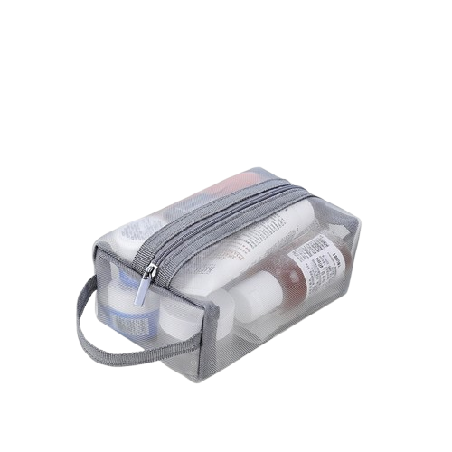 Sac cosmétique en maille de nylon transparent avec logo personnalisé, organisateur de pochette de maquillage à fermeture éclair de voyage