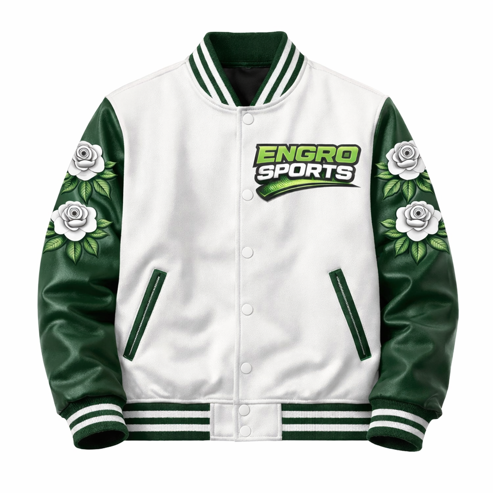 Blouson universitaire personnalisé avec logo, design sportif, marque privée, blouson universitaire OEM, blouson universitaire ODM, vert et blanc