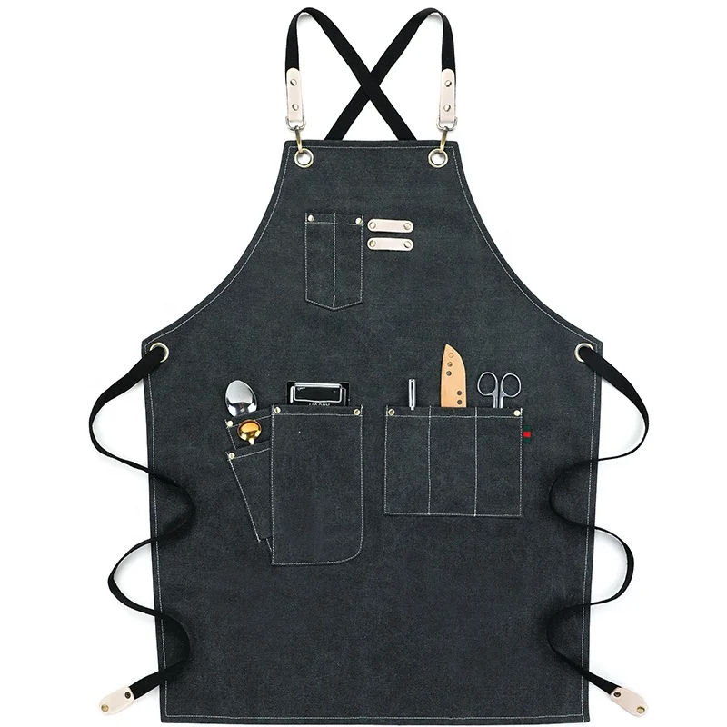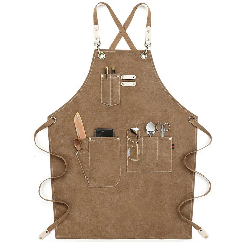 Tablier de cuisine en toile imperméable avec poches pour hommes et femmes serveur cafés ongles beauté salon de coiffure uniforme gril