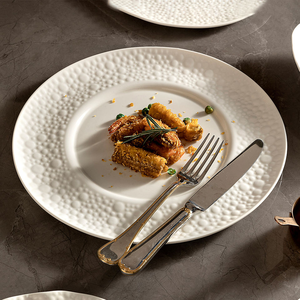 Assiettes rondes en porcelaine blanche avec logo personnalisé Assiettes micrréactives résistantes aux rayures Assiettes d'entrée en céramique haut de gamme pour restaurant