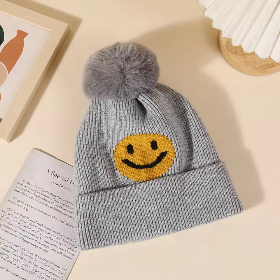Bonnet d'hiver en tricot personnalisé avec logo, bonnet épais avec sourire personnalisé, broderie de personnage, bonnet en acrylique, bonnet à pompon, chapeau d'hiver unisexe 2026