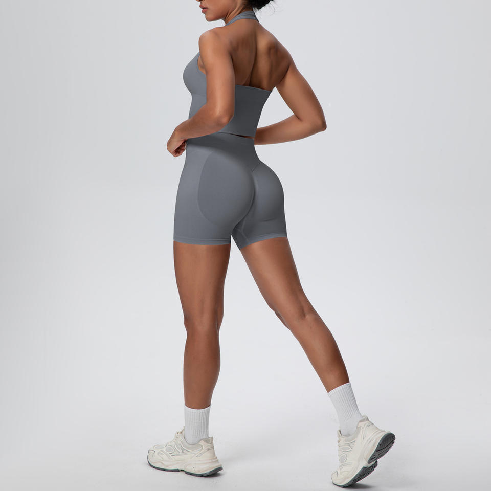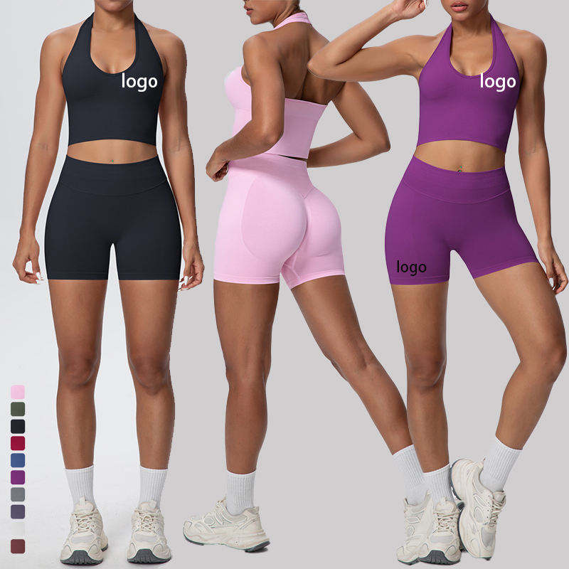 Ensemble de sport respirant pour femme avec logo personnalisé, soutien-gorge de sport dos croisé, short taille haute, leggings sans couture, 5 pièces pour gym et yoga