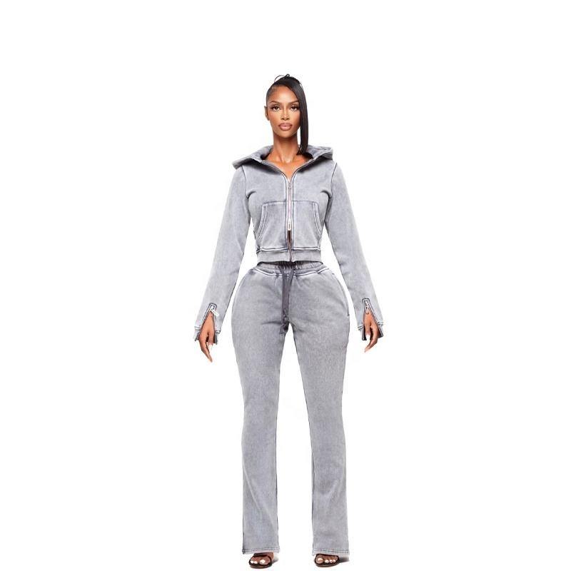 Custom Logo Women Cropped Hoodie Set Zip up Two 2 Piece Sweatpants and Hoodie Set Acid Washed Jogger Tracksuits Womens