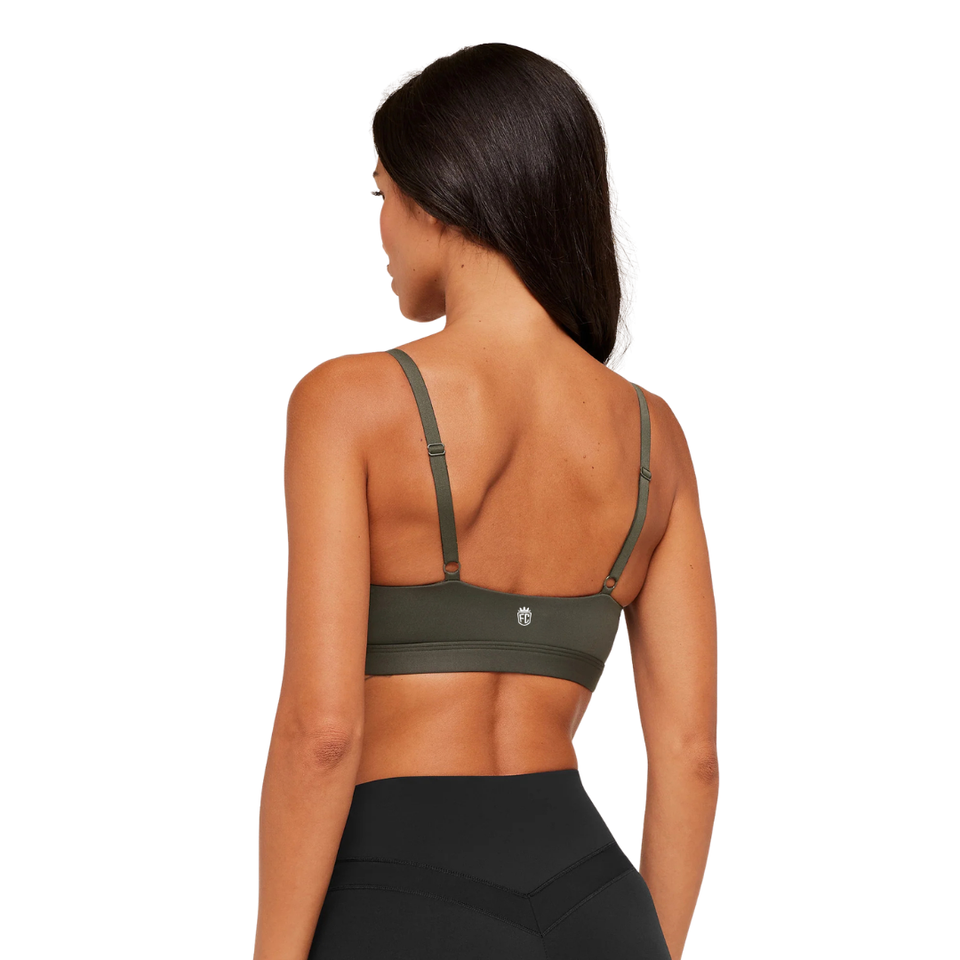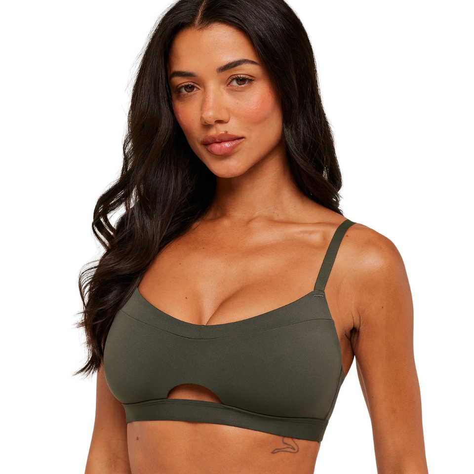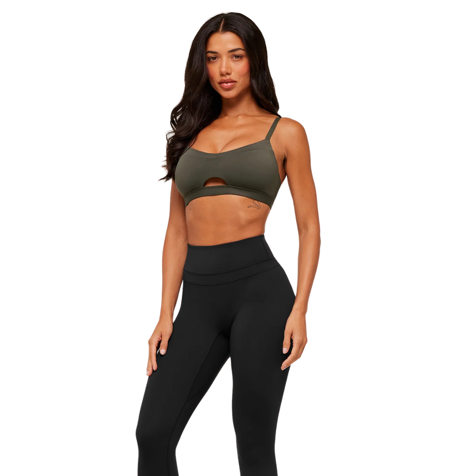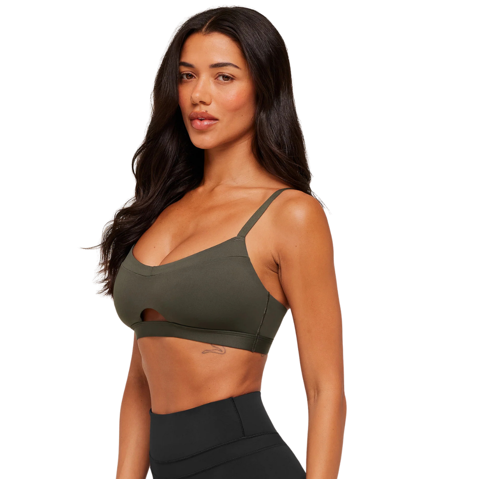 Soutien-gorge de sport vert Peekaboo pour femme avec logo personnalisé, en nylon et élasthanne, style balcon, soutien léger, idéal pour le yoga et l'entraînement fitness