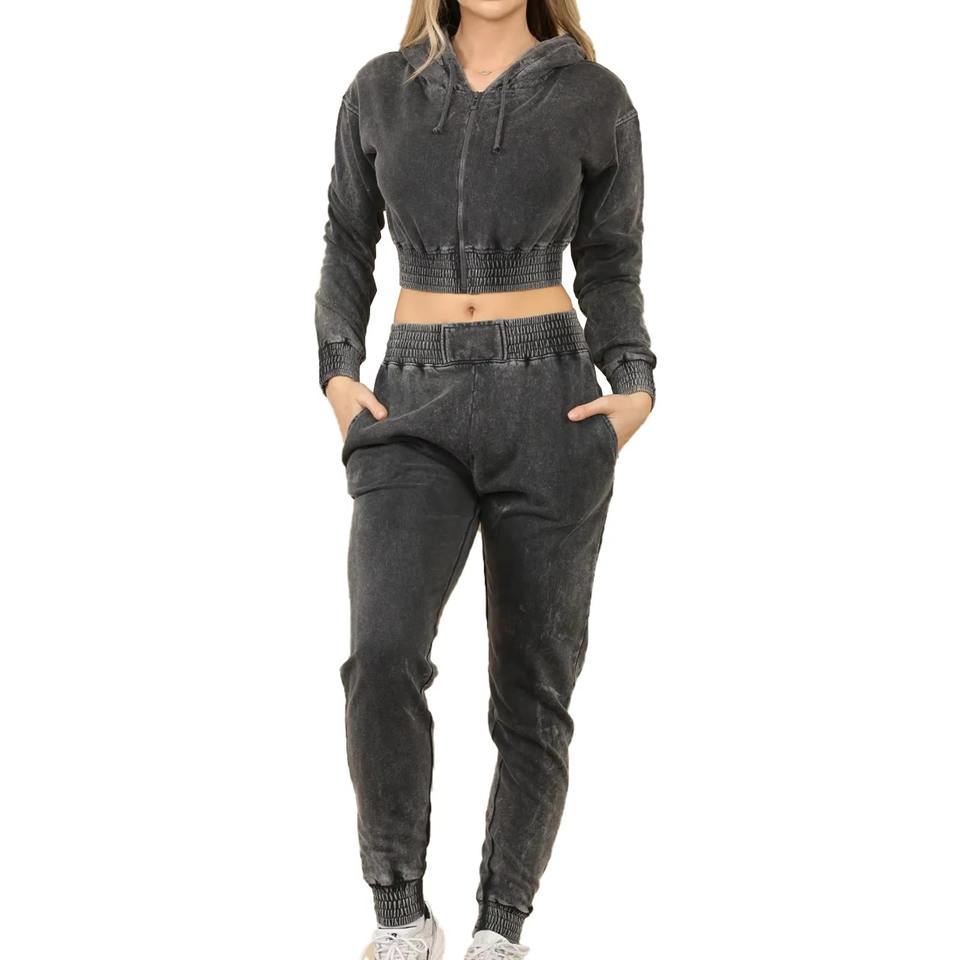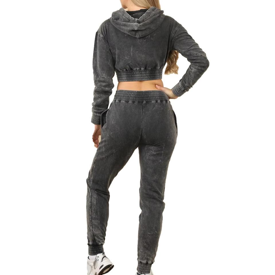 Logo personnalisé femmes deux pièces recadrée fermeture éclair survêtement Vintage acide lavage 100% coton polaire 400 Gsm courte longueur à capuche pour l'hiver