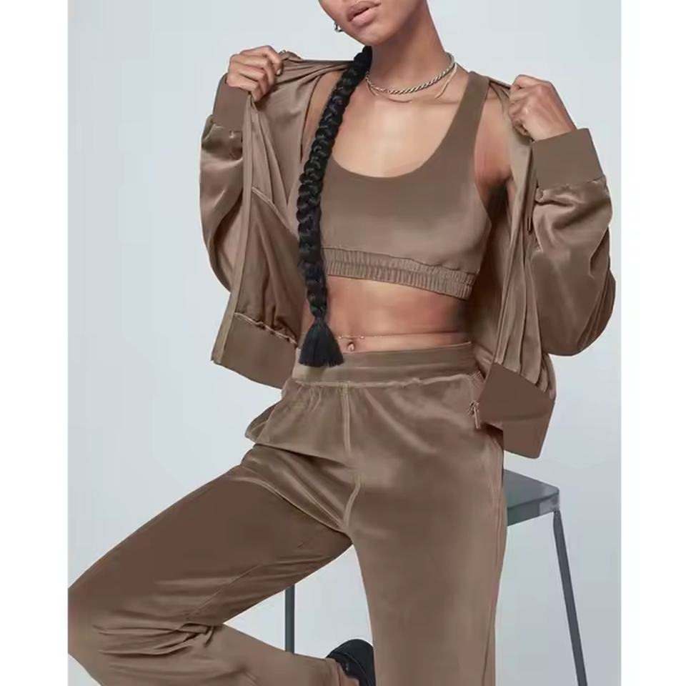 Custom Logo Women's Three Piece Suit Casual Sports Crop Top Zipper Hoodie High Rise Straight Leg Sweatpants Velvet Women's Suit