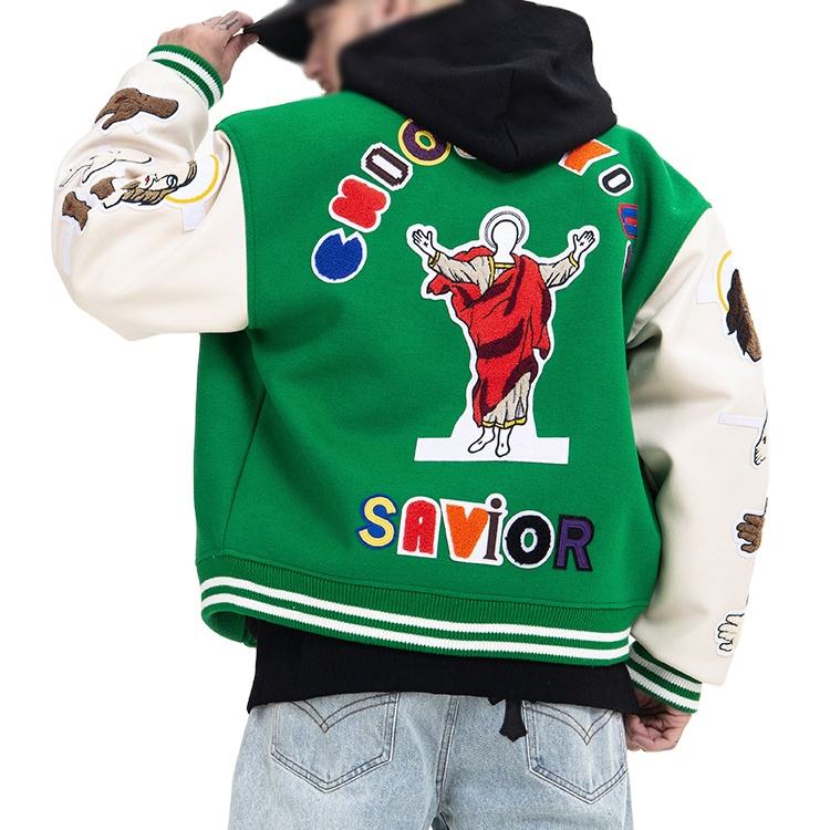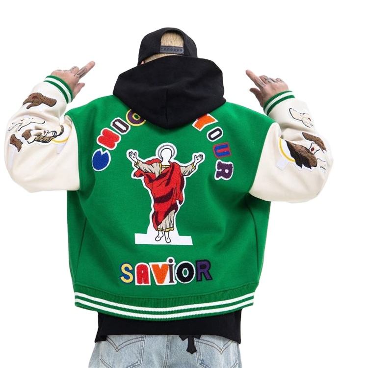Vestes de baseball en laine chenille brodée avec logo personnalisé pour hommes, manches en cuir vert vintage, vestes universitaires pour hommes