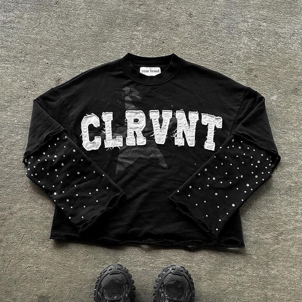 T-shirt personnalisé à manches longues avec double couche de strass Broderie en détresse T-shirt surdimensionné à double manches avec strass délavé au soleil pour hommes