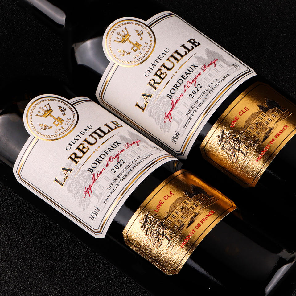 Ensemble d'étiquettes de vin de luxe personnalisées Bordeaux, estampage à chaud doré, papier texturé premium, étiquette d'emballage de bouteille de vin recto-verso