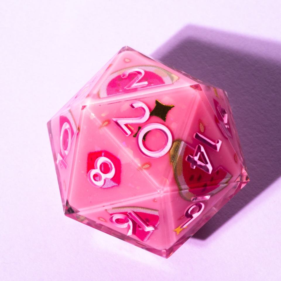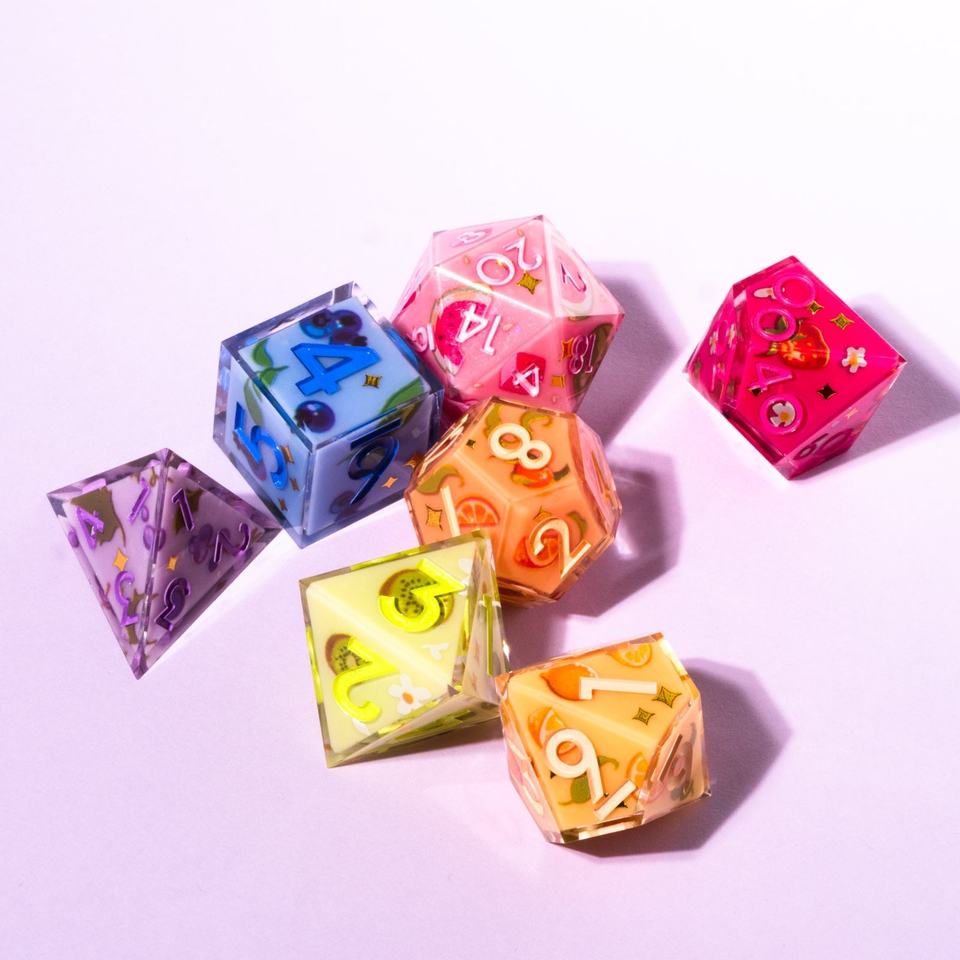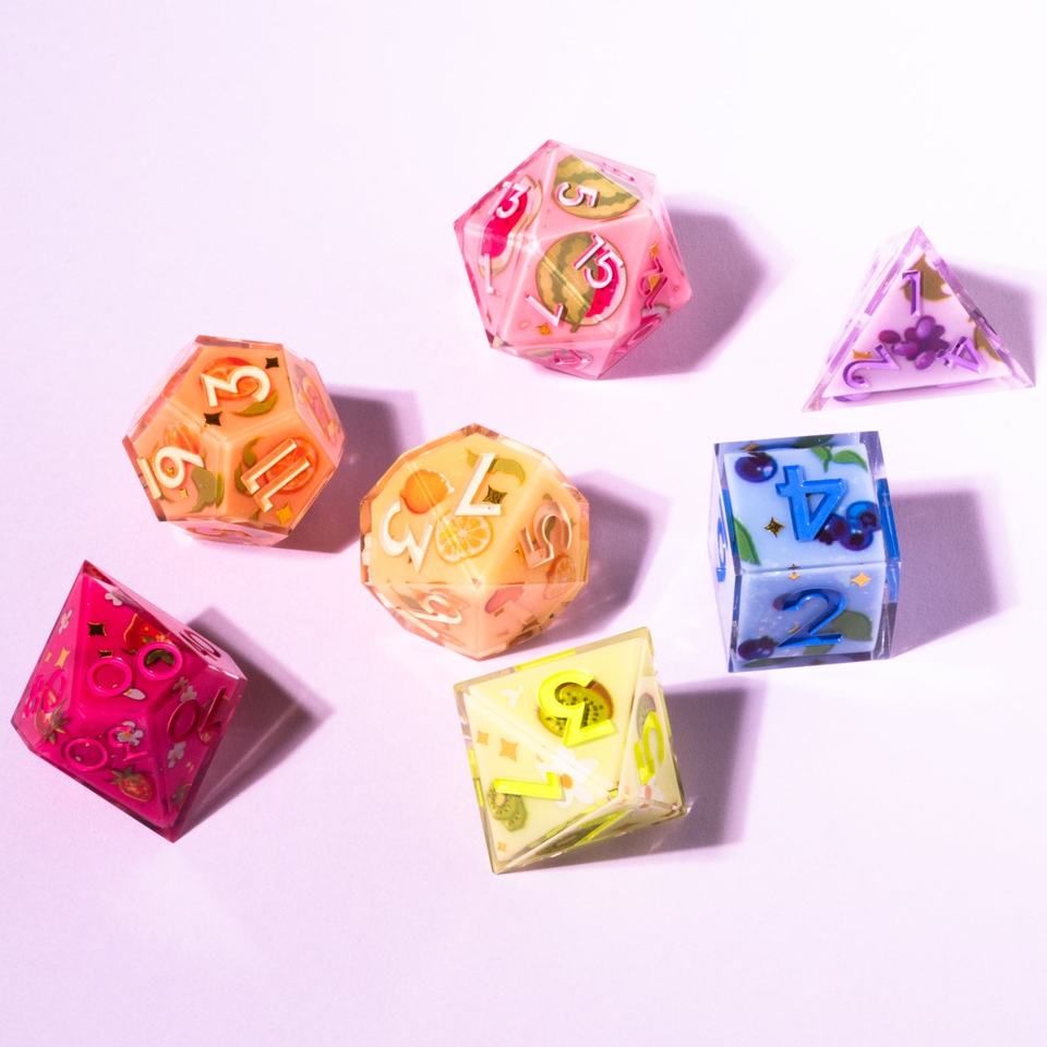 Custom Luxury Clear Acrylic Colorful Dice Fruit 7-Piece Iconic Dice Set Silver Number Sharp-edged Dice for Roles Play Games