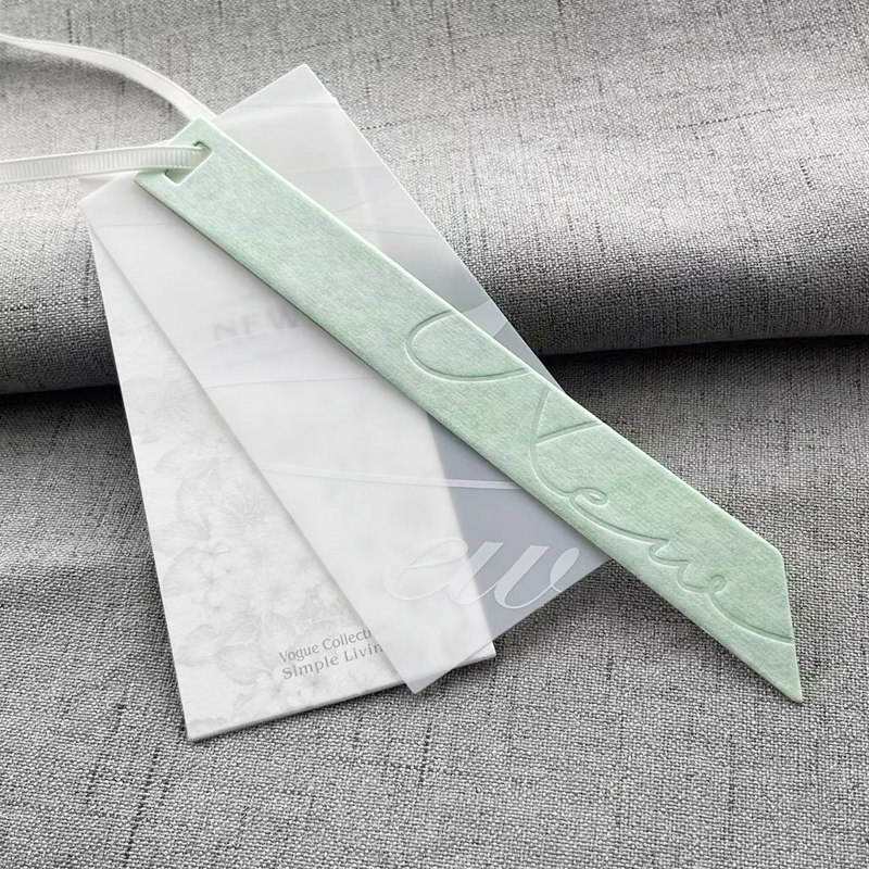 Étiquettes suspendues personnalisées de luxe en PVC givré translucide avec logo en relief pour vêtements, jeans et maillots de bain