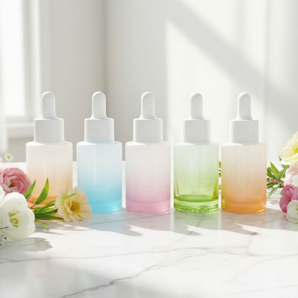 Flacon compte-gouttes en verre coloré de forme ronde plate, vert dégradé, de luxe personnalisé, avec bouchon pipette blanc pour sérum et huile essentielle