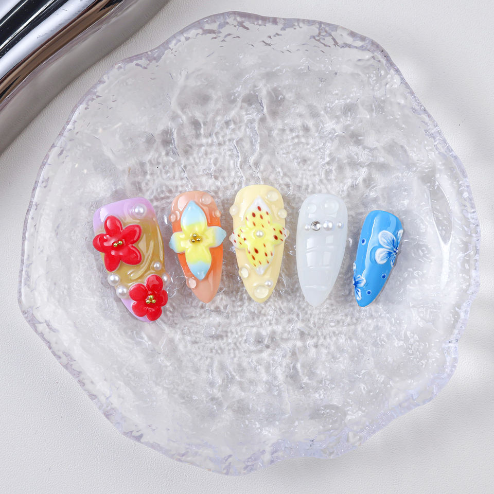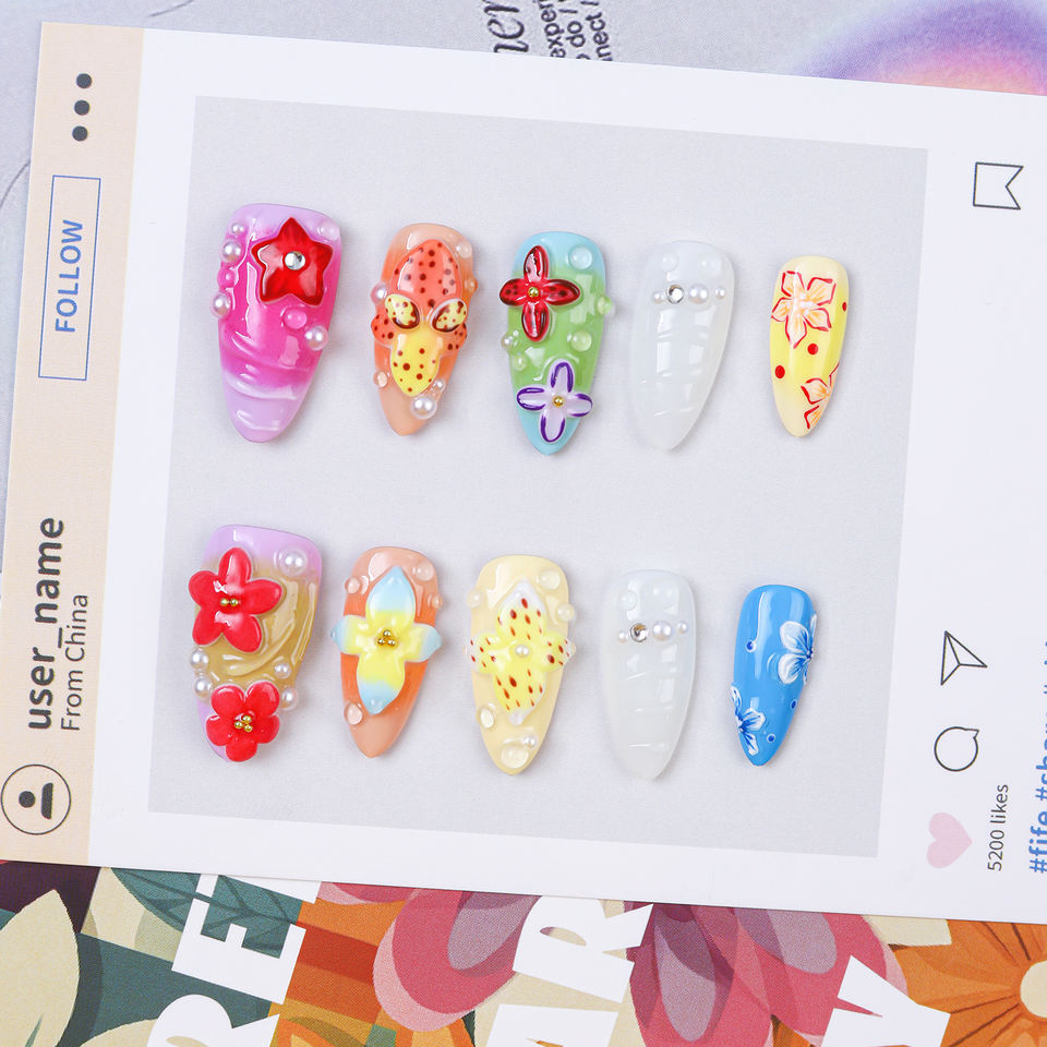 Presse sur les ongles faite à la main réutilisable de luxe personnalisé 10 pièces Amande 3d Fleur vente en gros de faux ongles avec de la colle