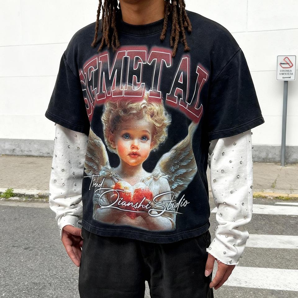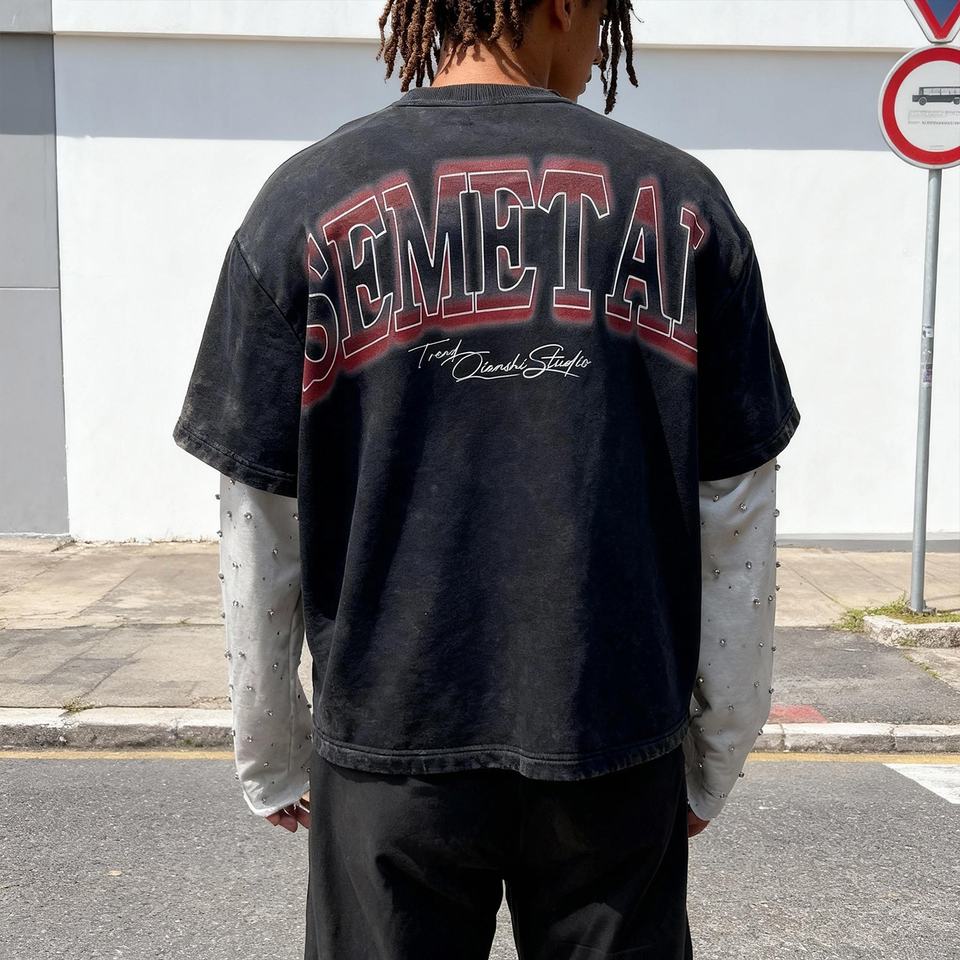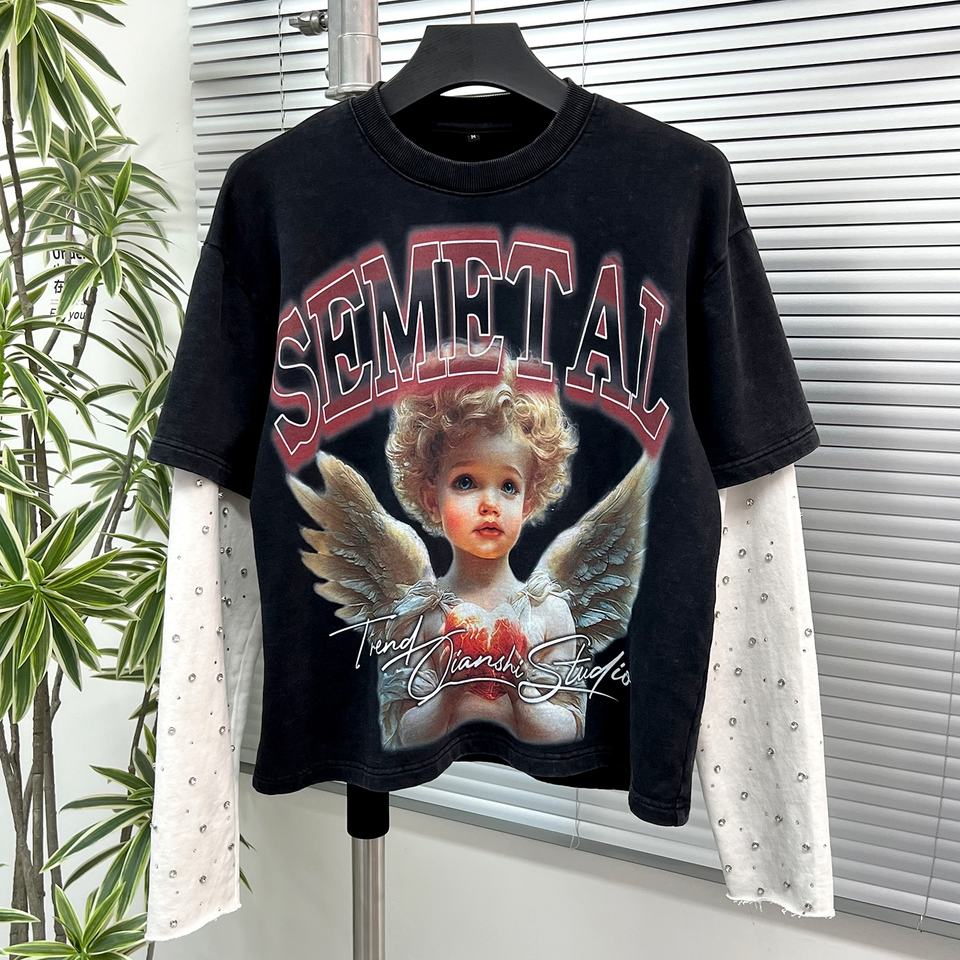 T-shirts surdimensionnés personnalisés de luxe avec graphiques en strass pour hommes, en coton lourd, lavage à l'acide, double couche, manches longues