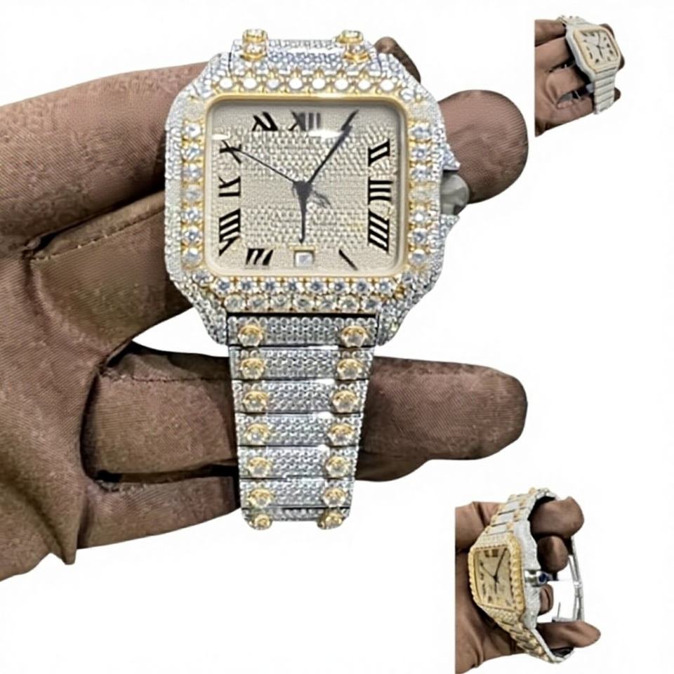 Montre de luxe personnalisée en acier inoxydable avec verre carré en moissanite, clarté VVS1, bicolore, chiffres romains, passe le testeur de diamant, 10 bars