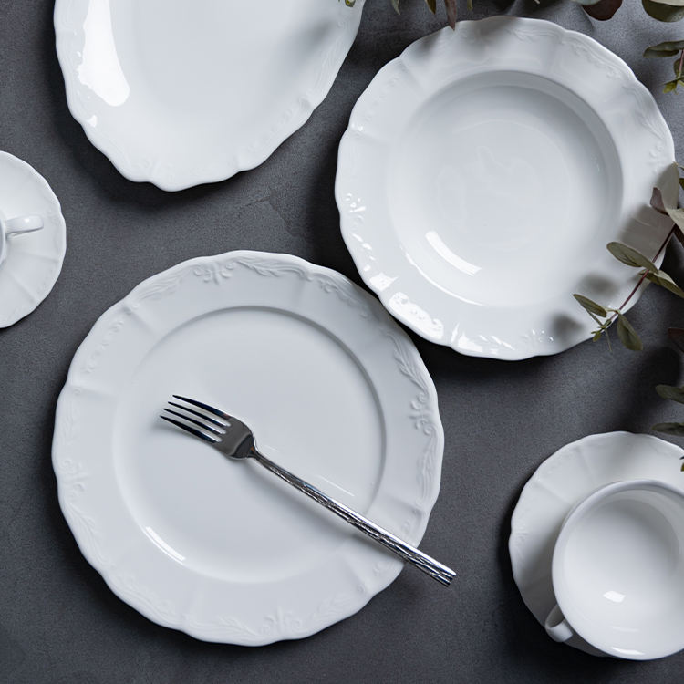 Service de vaisselle en porcelaine blanche de luxe personnalisé, motif floral, style européen, assiette, bol, tasse pour hôtel, restaurant, vente en gros